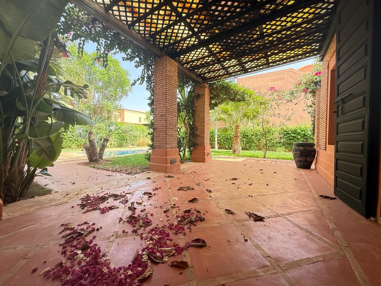 Située en angle de rue, avec deux façades et aucun vis-à-vis, cette villa allie esthétique marocaine contemporaine, confort moderne et intimité absolue.