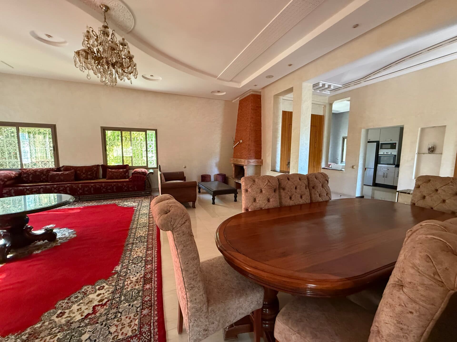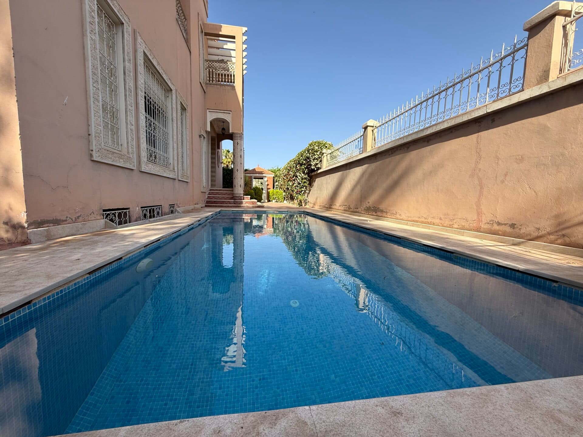 Édifiée sur un terrain de 510 m², avec 400 m² habitables, elle offre 4 suites, plusieurs salons, une cuisine équipée, ainsi qu’un potentiel d’extension ou de jouissance complémentaire du terrain en raison de l’absence de construction future face à la villa.