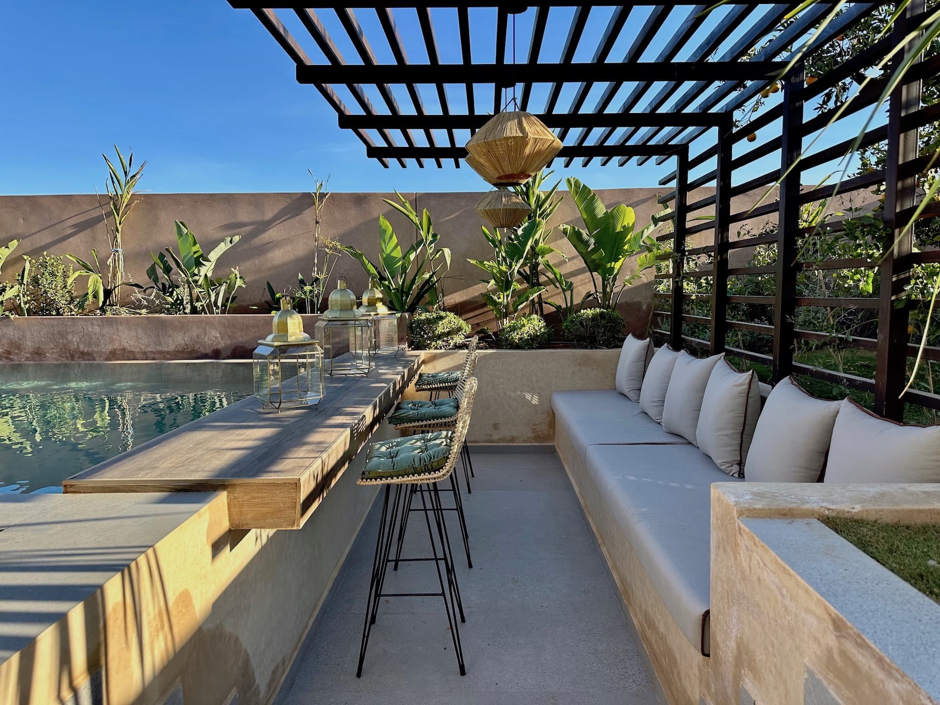 Les espaces intérieurs s'organisent autour de une suite 1 : Salle de bain avec douche, WC et terrasse privée, une suite 3 : Salle de bain (douche, WC et fenêtre), une suite 4 : Dressing, salle de bain (douche, WC et fenêtre) donnant sur la piscine suspendue et espaces bien-être : Hammam, salle de massage et espace de repos. Le cadre extérieur se distingue par une vue exceptionnelle sur les montagnes de l’Atlas et emplacement premium : Situé au cœur du golf d’Amelkis, à 15 minutes de Marrakech. Parmi les prestations de standing, on retrouve conception moderne : Climatisation gainable, panneaux solaires, double vitrage.
