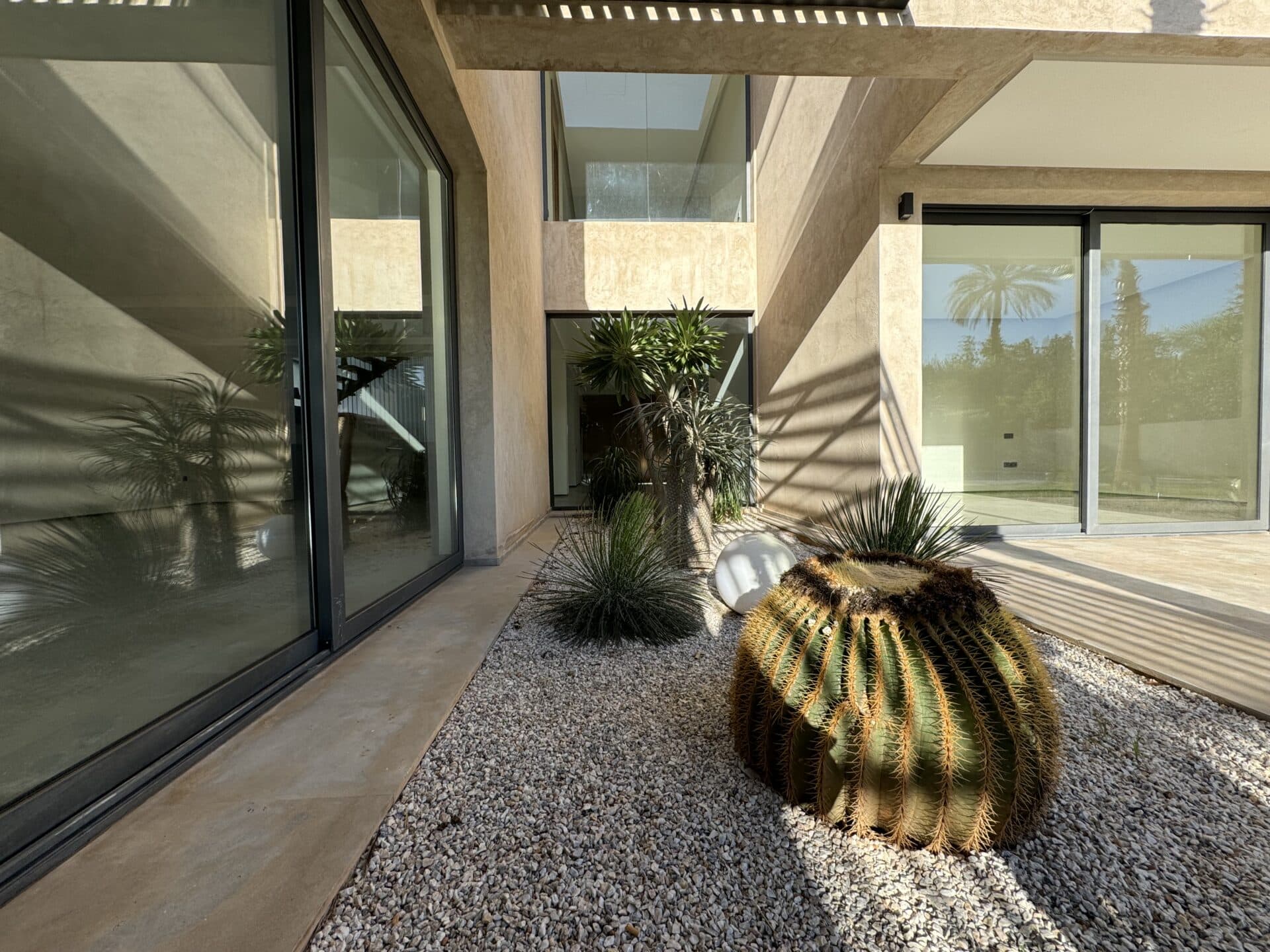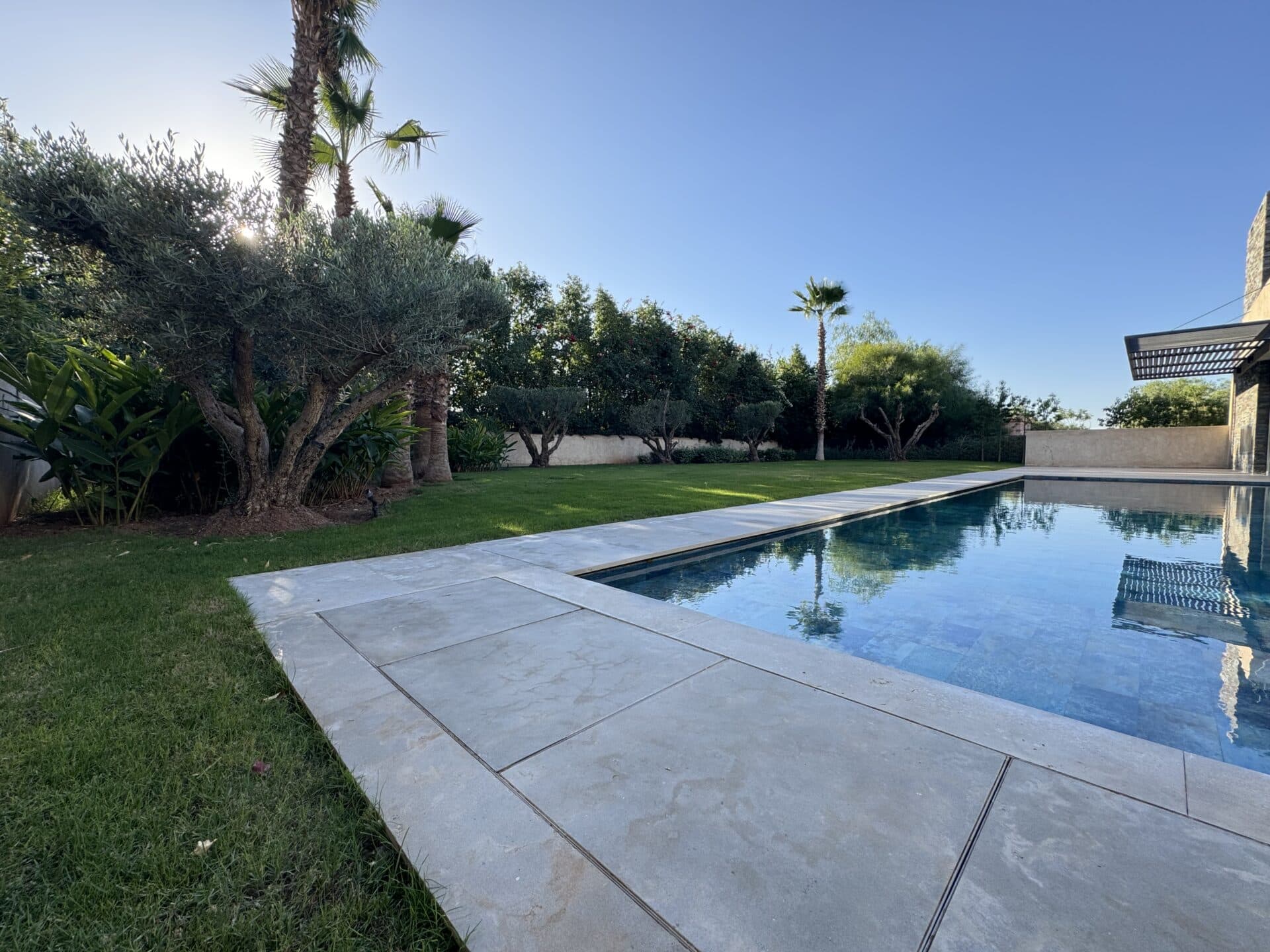 Les espaces intérieurs s'organisent autour de un salon spacieux et salle à manger avec vue sur la piscine, une cuisine équipée séparée avec arrière-cuisine fonctionnelle, une suite 2 : Salle de bain (douche, WC), placards, vue jardin et piscine, une suite 3 : Identique, offrant un confort absolu et espaces bien-être : Hammam, jacuzzi extérieur, salle de sport. Les extérieurs offrent une piscine privée avec vue dégagée sur le jardin et emplacement privilégié : Au cœur du golf d’Amelkis, à 15 minutes du centre-ville. Parmi les prestations de standing, on retrouve matériaux de qualité : Aluminium double vitrage, climatisation gainable.