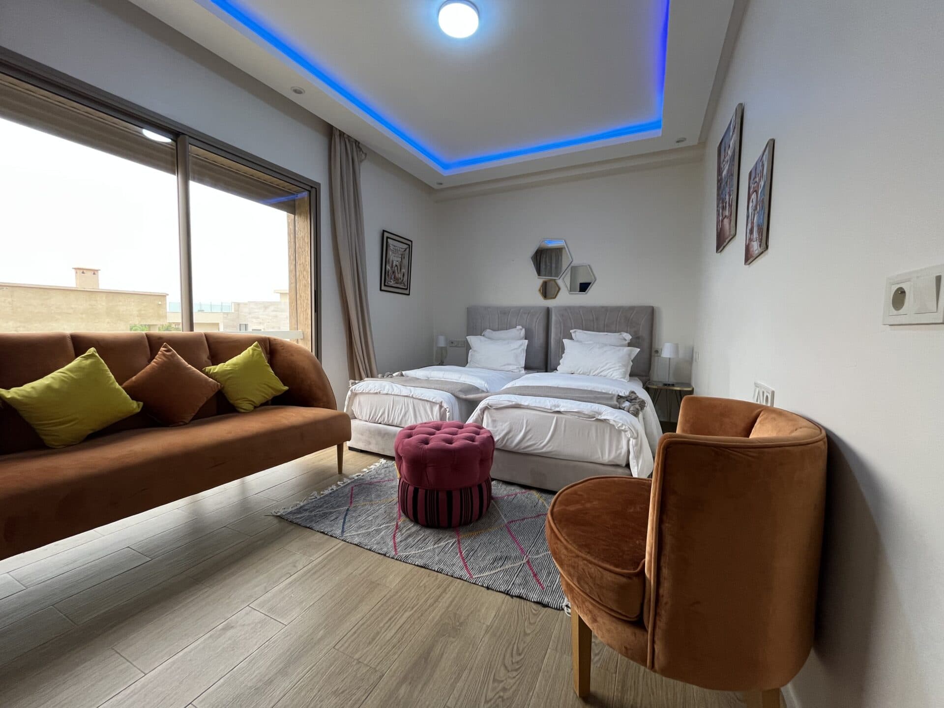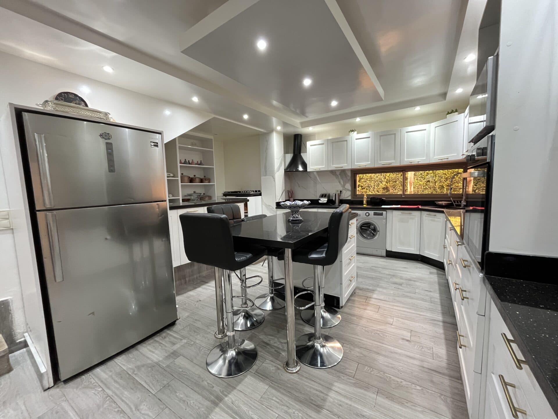 Conçue pour un confort optimal, elle propose 5 suites, plusieurs salons ouverts sur le jardin, une climatisation complète et un rooftop panoramique. Une opportunité rare pour les amateurs de belles adresses et de calme absolu à Marrakech.